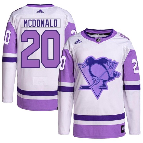 Prove you are the #1 Pittsburgh Penguins fan with this Men's Pittsburgh Penguins Ab Mcdonald Adidas Authentic Hockey Fights Cancer Primegreen Jersey - White/Purple! This jersey is perfect for the Pittsburgh Penguins fan who wants a great new way to show some spirit for the Penguins.