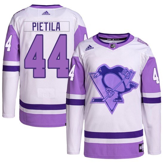 Prove you are the #1 Pittsburgh Penguins fan with this Men's Pittsburgh Penguins Chase Pietila Adidas Authentic Hockey Fights Cancer Primegreen Jersey - White/Purple! This jersey is perfect for the Pittsburgh Penguins fan who wants a great new way to show some spirit for the Penguins.