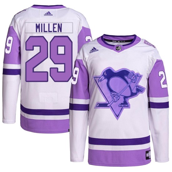 Prove you are the #1 Pittsburgh Penguins fan with this Men's Pittsburgh Penguins Greg Millen Adidas Authentic Hockey Fights Cancer Primegreen Jersey - White/Purple! This jersey is perfect for the Pittsburgh Penguins fan who wants a great new way to show some spirit for the Penguins.