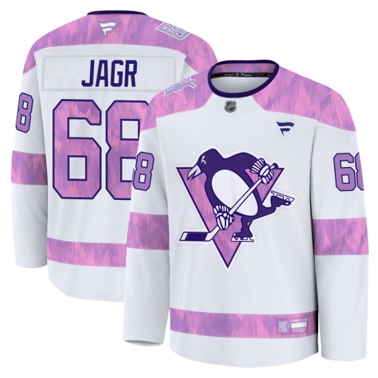 Show them you are the #1 Pittsburgh Penguins fan when you wear this Men's Pittsburgh Penguins Jaromir Jagr Fanatics Premium 2024 Hockey Fights Cancer Practice Jersey - White! Featuring Pittsburgh Penguins graphics, this jersey will keep you comfortable and full of team spirit. It is a must-have for fans of any age!