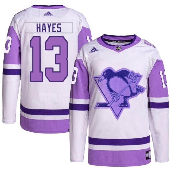 Prove you are the #1 Pittsburgh Penguins fan with this Men's Pittsburgh Penguins Kevin Hayes Adidas Authentic Hockey Fights Cancer Primegreen Jersey - White/Purple! This jersey is perfect for the Pittsburgh Penguins fan who wants a great new way to show some spirit for the Penguins.