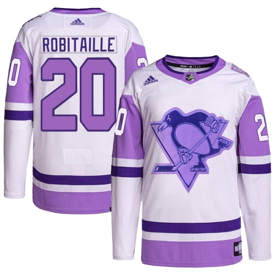Prove you are the #1 Pittsburgh Penguins fan with this Men's Pittsburgh Penguins Luc Robitaille Adidas Authentic Hockey Fights Cancer Primegreen Jersey - White/Purple! This jersey is perfect for the Pittsburgh Penguins fan who wants a great new way to show some spirit for the Penguins.