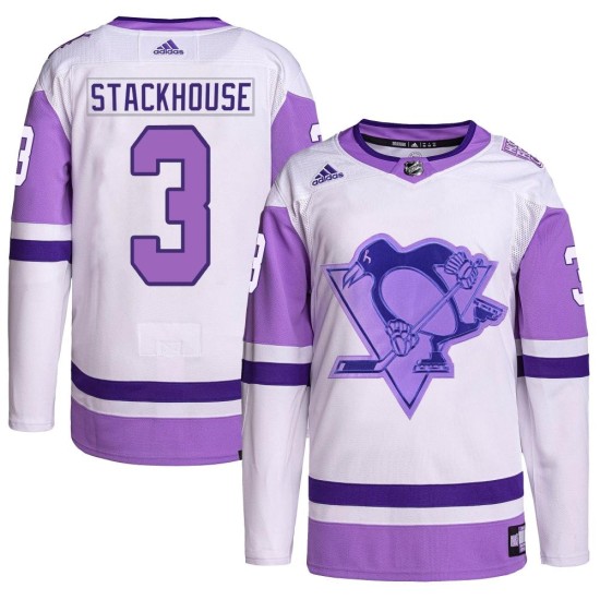 Prove you are the #1 Pittsburgh Penguins fan with this Men's Pittsburgh Penguins Ron Stackhouse Adidas Authentic Hockey Fights Cancer Primegreen Jersey - White/Purple! This jersey is perfect for the Pittsburgh Penguins fan who wants a great new way to show some spirit for the Penguins.