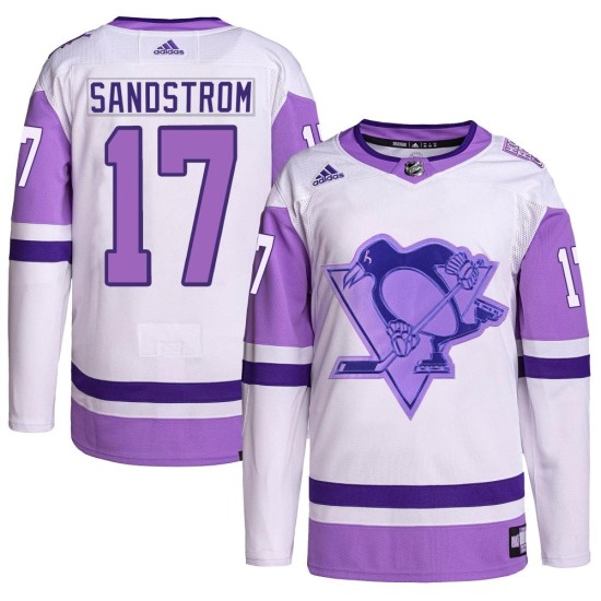 Prove you are the #1 Pittsburgh Penguins fan with this Men's Pittsburgh Penguins Tomas Sandstrom Adidas Authentic Hockey Fights Cancer Primegreen Jersey - White/Purple! This jersey is perfect for the Pittsburgh Penguins fan who wants a great new way to show some spirit for the Penguins.