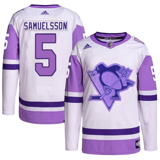 Prove you are the #1 Pittsburgh Penguins fan with this Men's Pittsburgh Penguins Ulf Samuelsson Adidas Authentic Hockey Fights Cancer Primegreen Jersey - White/Purple! This jersey is perfect for the Pittsburgh Penguins fan who wants a great new way to show some spirit for the Penguins.