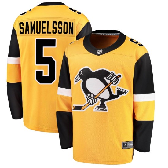 Show them you are the #1 Pittsburgh Penguins fan when you wear this Men's Pittsburgh Penguins Ulf Samuelsson Fanatics Branded Breakaway Alternate Jersey - Gold! Featuring Pittsburgh Penguins graphics, this jersey will keep you comfortable and full of team spirit. It is a must-have for fans of any age!